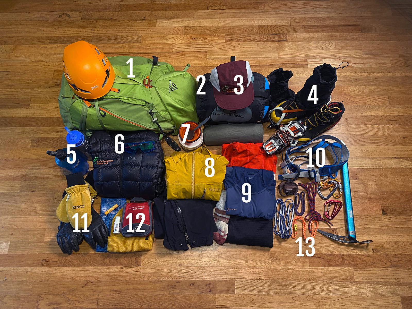 - Climbing gear : harness, helmet, mountaineering axe