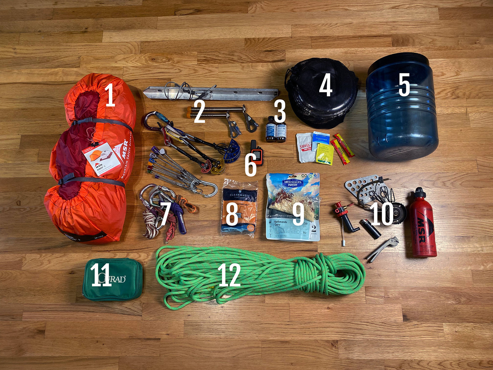 - Glacier kit : 3 non-locking carabiners, 3 pear shaped locking carabiners, 1 double (48”) length sewn runner (120 cm sling), 1 sewn prusik cord (60cm (BEAL Jammy or similar)), 1 triple (180cm) length sewn sling