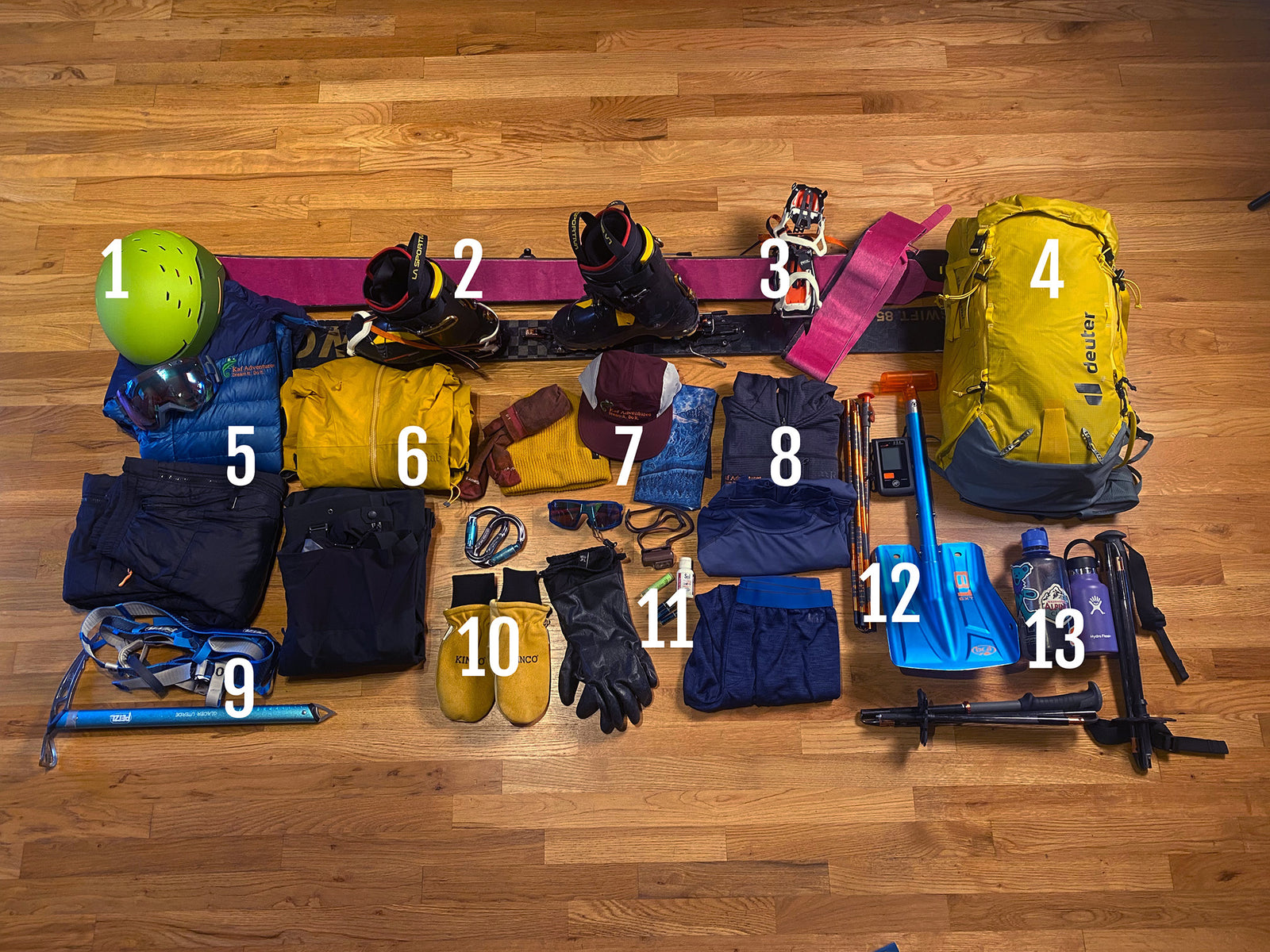 - Ski or splitboard setup : boots (hard boots are strongly preferred for splitboarders), skis/splitboard, appropriate bindings, climbing skins, poles