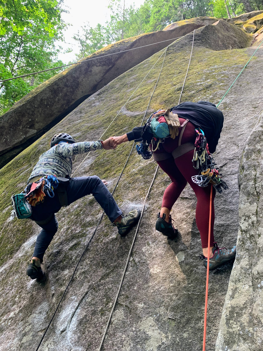 • Traditional gear placements and lead climbing strategies.