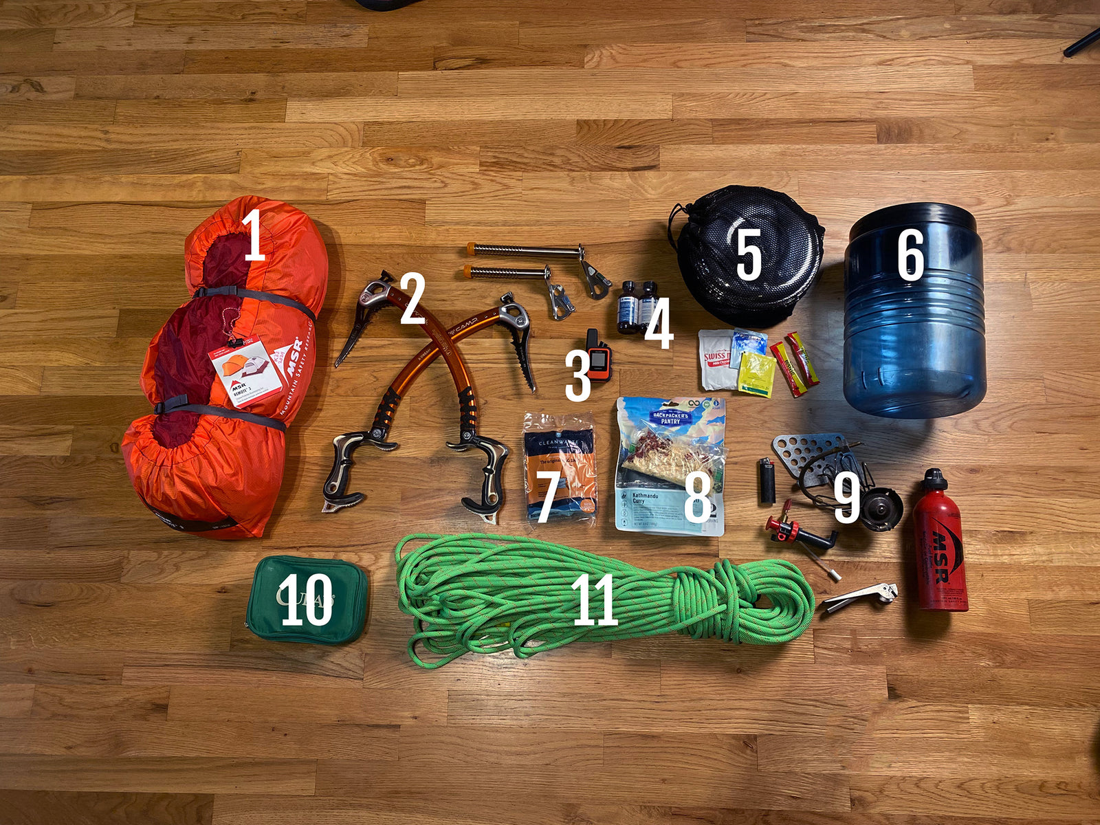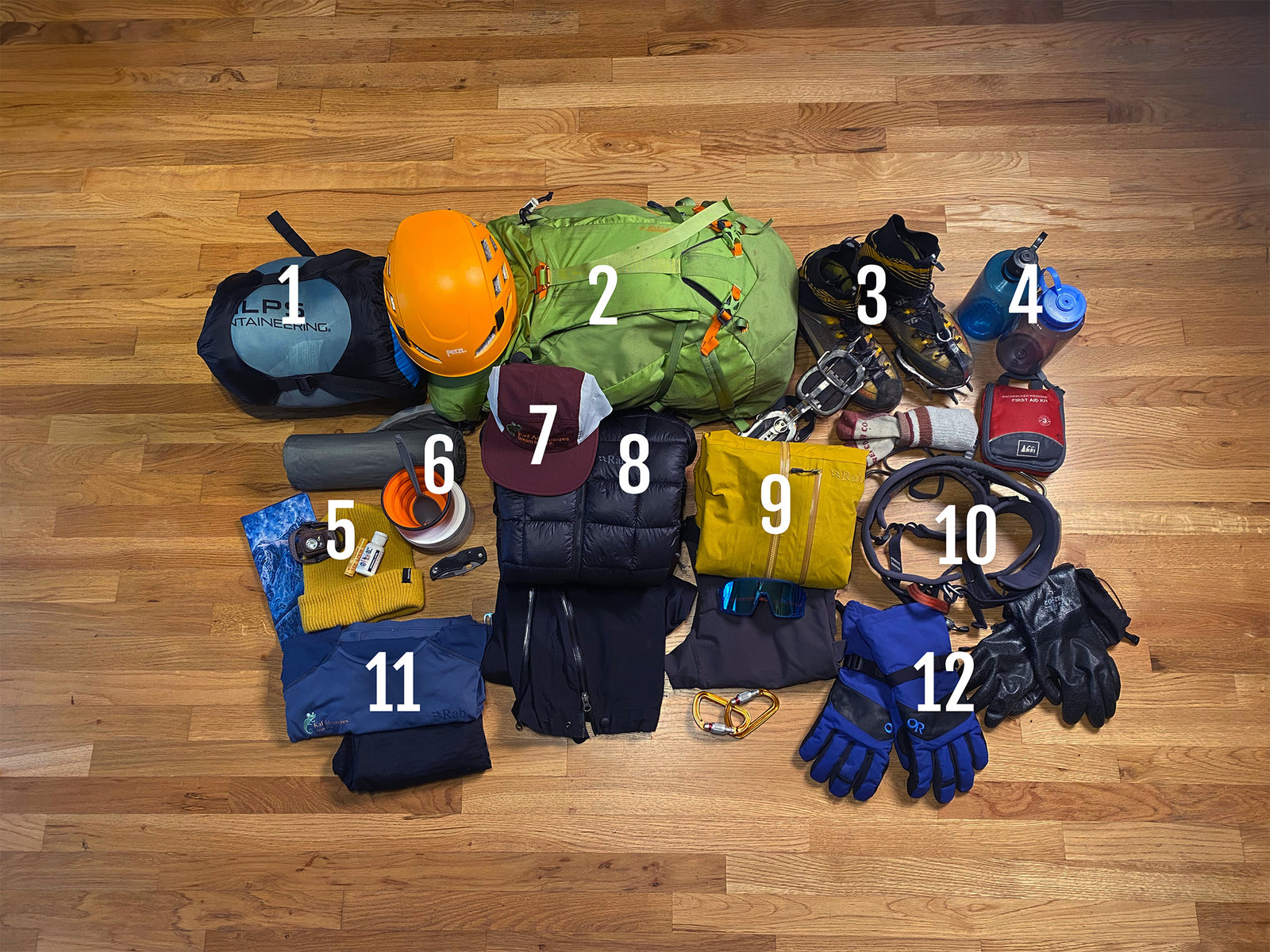 - Climbing gear : harness (rock climbing style preferred over glacier style), 2 pear-shaped locking carabiners, climbing helmet